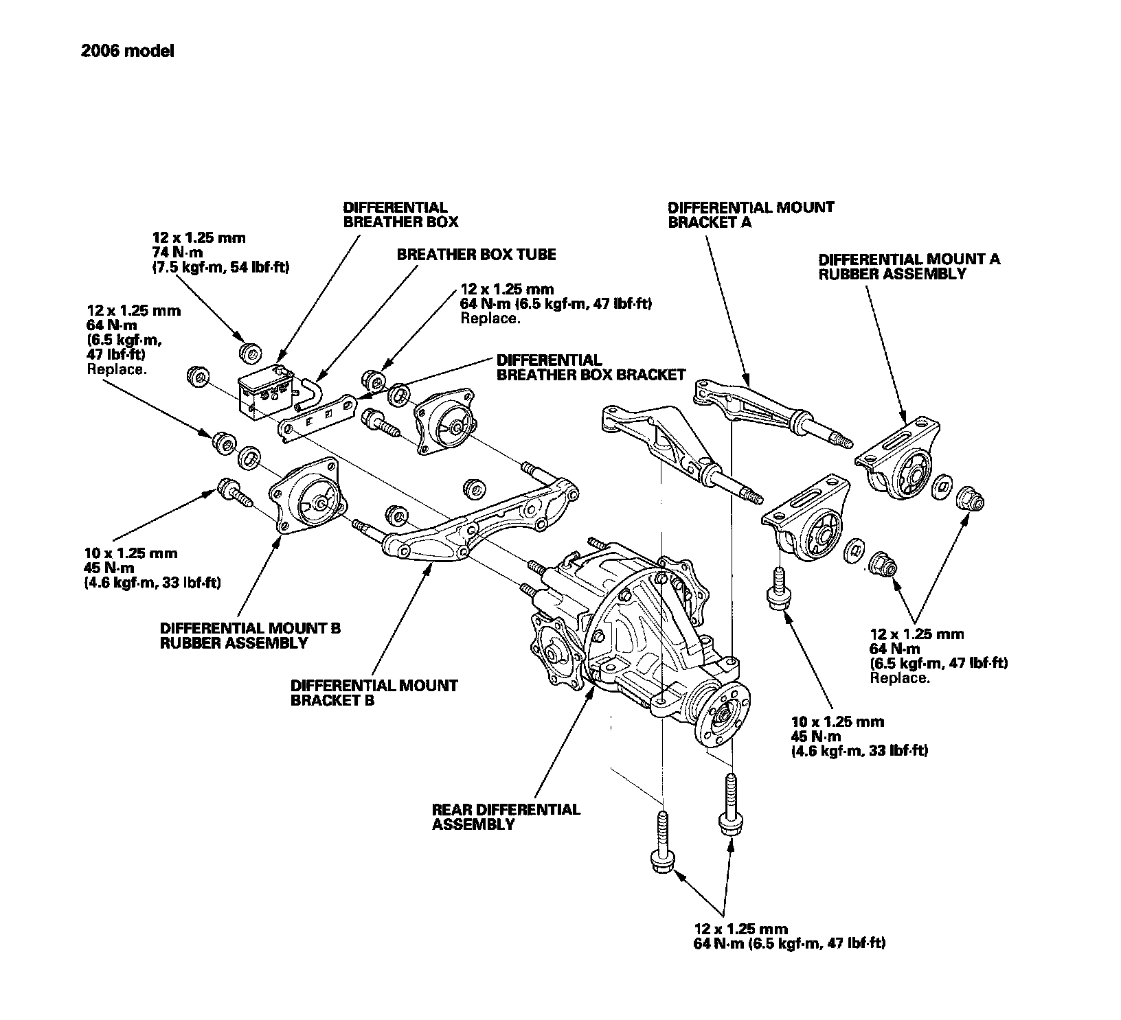 If installing the rear differential and mount assemblies, tighten the differential mount bracket B mounting nuts first, then the differential mount bracket A mounting bolts.