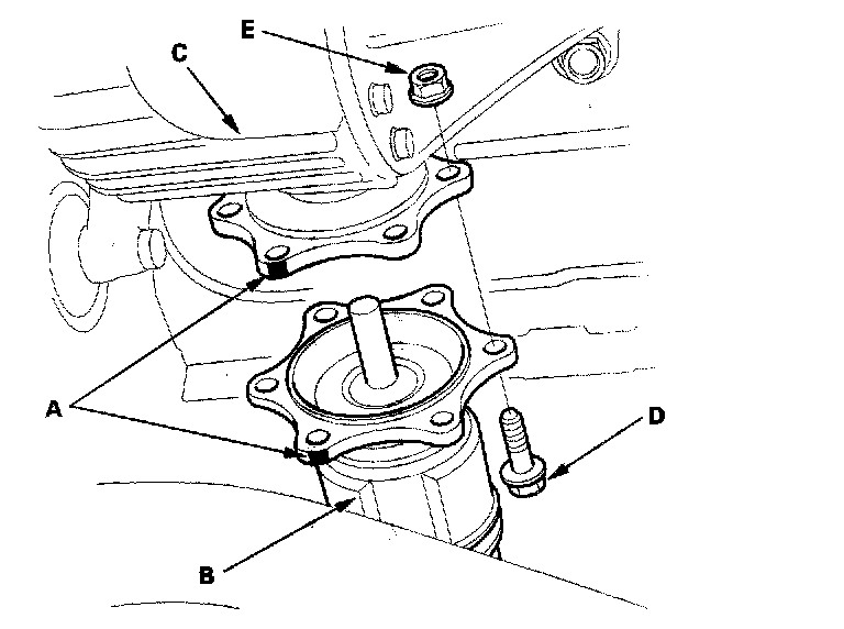 7. Remove the six inboard joint mounting bolts (D) and nuts (E), then remove the inboard joint from the rear differential.