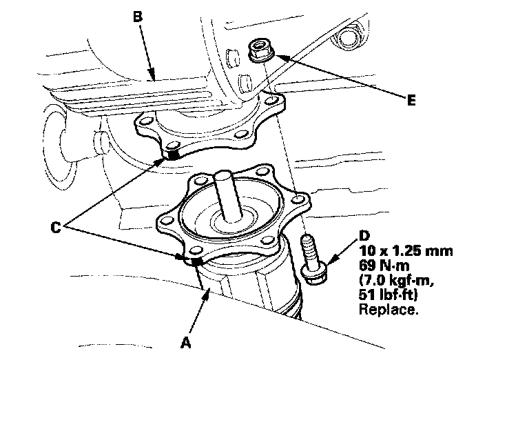 2. Install the inboard joint (A) into the rear differential (B) by aligning the reference marks (C), then install the six inboard joint mounting bolts (D) and nuts (E).