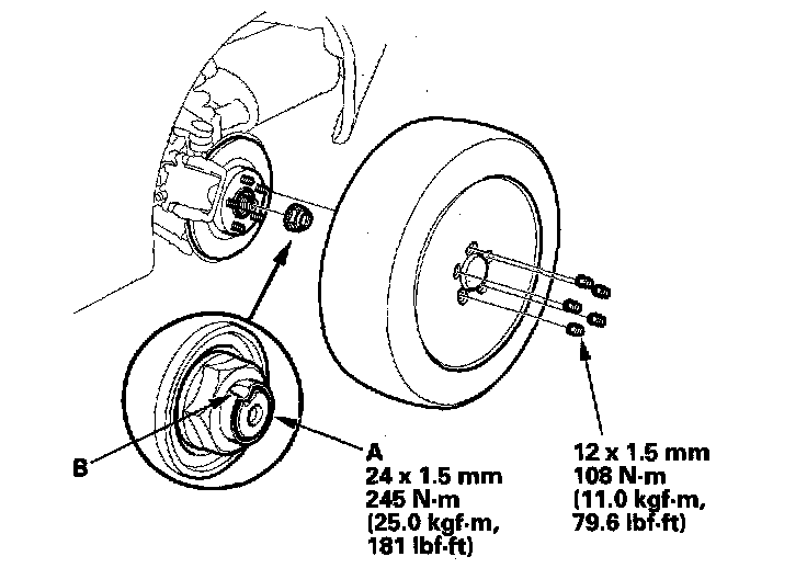 6. Install a new spindle nut (A), then tighten the nut. After tightening, use a drift to stake the spindle nut shoulder (B) against the driveshaft.