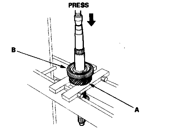 9. Support 6th gear (A) with a commercially available bearing separator, and remove the 5th/6th synchro hub/sleeve (B), synchro ring, synchro spring, and 6th gear using a press as shown.