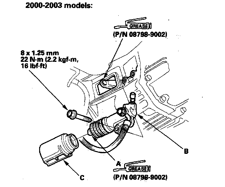 13. Apply super high urea grease (P/N 08798-9002) to the end of the slave cylinder pushrod (A). Install the slave cylinder (B) and the release fork boot (C).