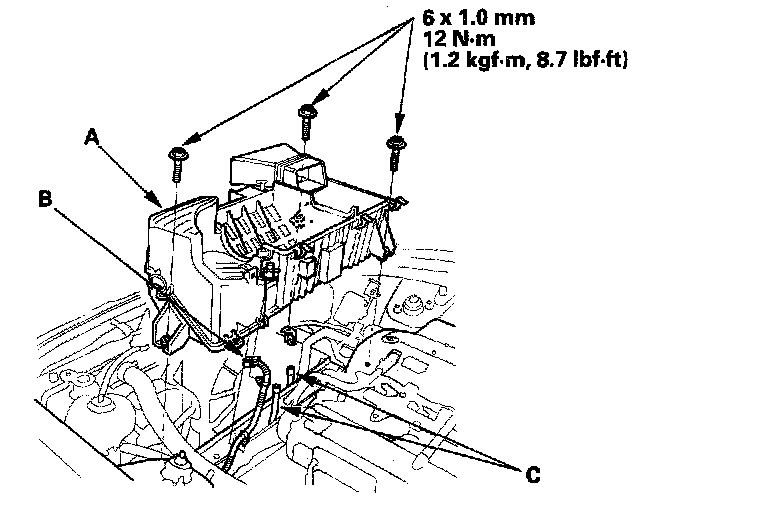 36. 2000-2005 models: Install the air cleaner housing (A), then connect the air control solenoid valve connector (B) and vacuum hoses (C).