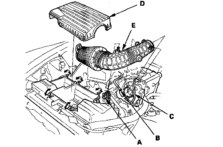 8. 2000-2005 models: Disconnect the control solenoid valve connector (A) and vacuum hoses (B), then remove the air cleaner housing (C).