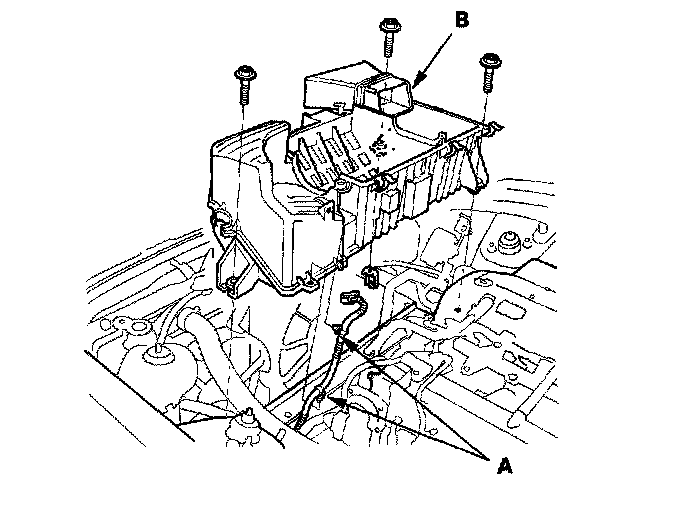 10. 2006 model: Remove IAT sensor harness clamps (A), then remove the air cleaner housing (B).