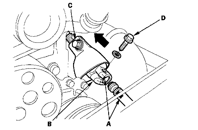 17. 2000-2005 models: Remove the upper starter motor mounting bolt (A) and upper intake manifold bracket mounting bolt (B). Disconnect the hose (C) from the suction valve.