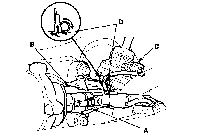 22. Disconnect the torque sensor 3P connector (C), and remove the wire harness clamp (D).