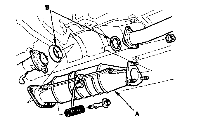 28. Remove the three way catalytic converter (TWC) (A) and gaskets (B).
