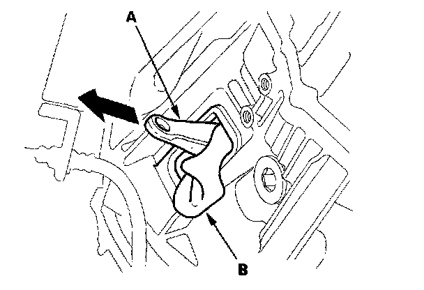 33. Pull out the release fork (A) from the release fork hanger. Wedge a shop towel (B) between the opening in the clutch housing and the release fork to hold the release fork in place.