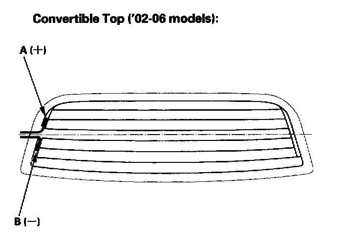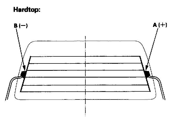 1. Check for voltage between the positive terminal (A) and body ground with the ignition switch and defogger switch ON. There should be battery voltage.