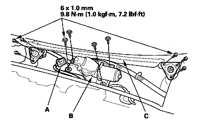 4. Remove the bolts, then remove windshield wiper linkage assembly (C).