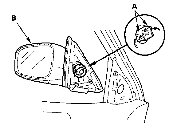 5. On power mirror models: While holding the mirror, push in on the connector clip tabs (A), then push out to remove the mirror (B). Take care not to scratch the door.