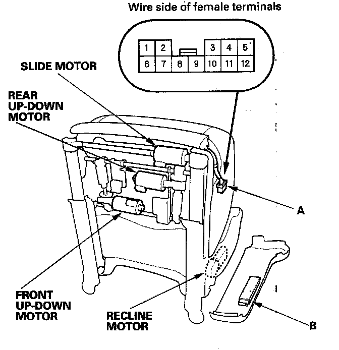 2. Disconnect the 5P connector (A) from the power seat adjustment switch (B).