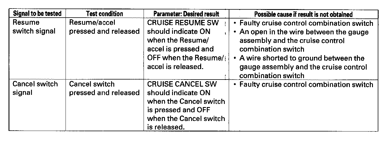 NOTE: Intermittent failures are often caused by loose circuit connections. While monitoring cruise control inputs, flex their circuits, and note if any of the test result change.