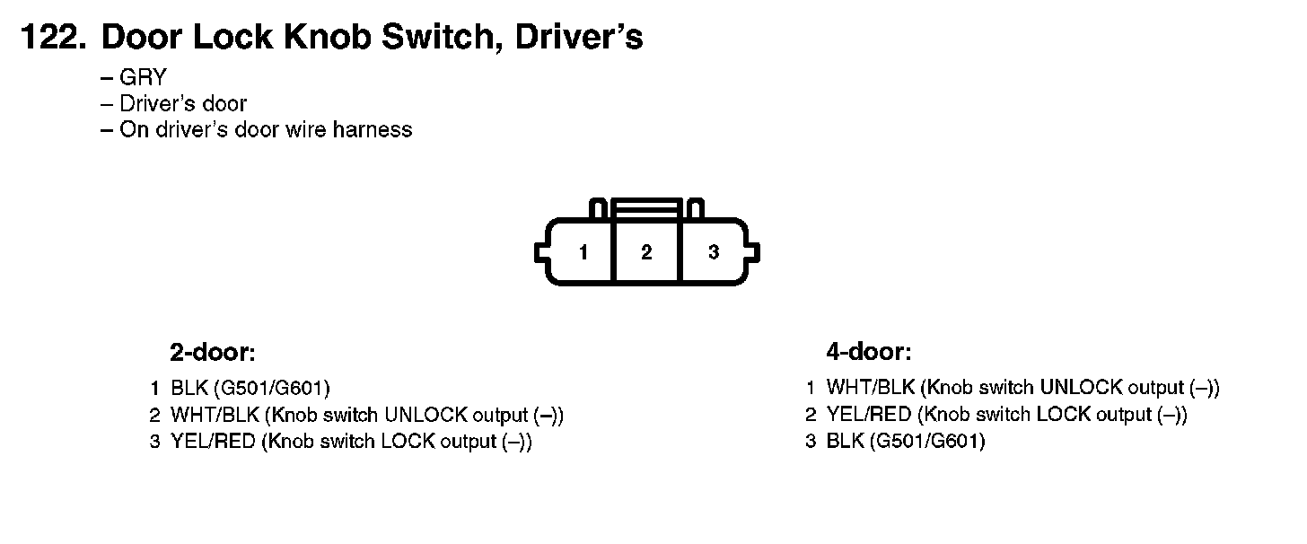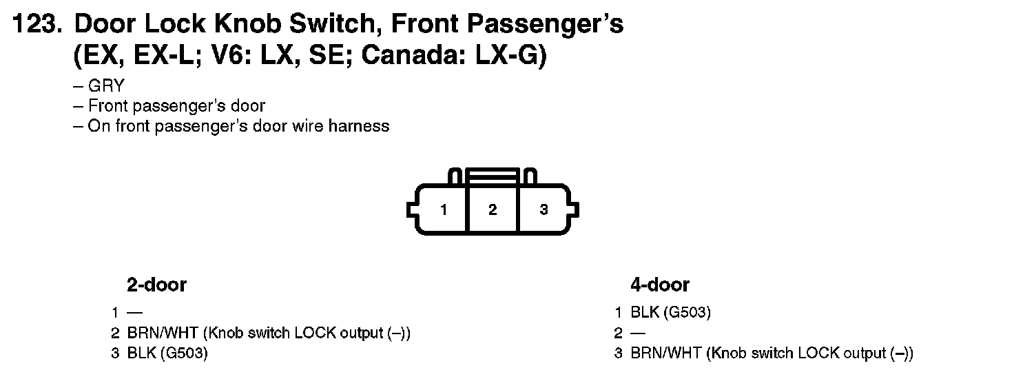 123. Door Lcok Knob Switch, Front Passenger's (EX, EX-L; V6: LX, SE; Canada: LX-G):