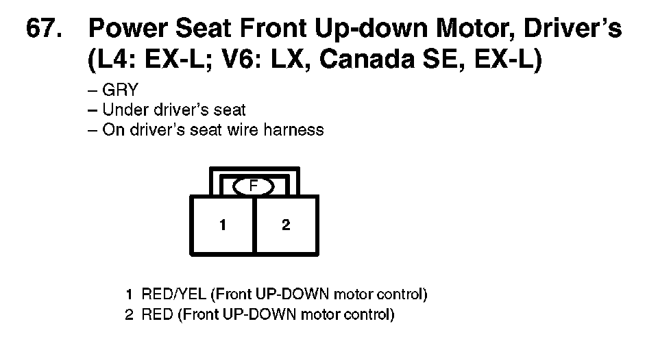 67. Power Seat Front Up-down Motor, Driver's (L4: EX-L; V6: LX, Canada SE, EX-L):
