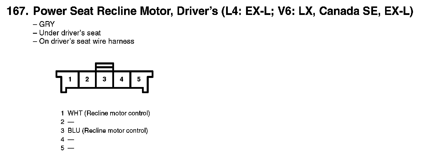 167. Power Seat Recline Motor, Driver's (L4: EX-L; V6: LX, Canada SE, EX-L):