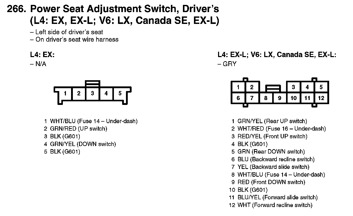 266. Power Seat Adjustment Switch, Driver's (L4: EX, EX-L; V6: LX, Canada SE, EX-L):