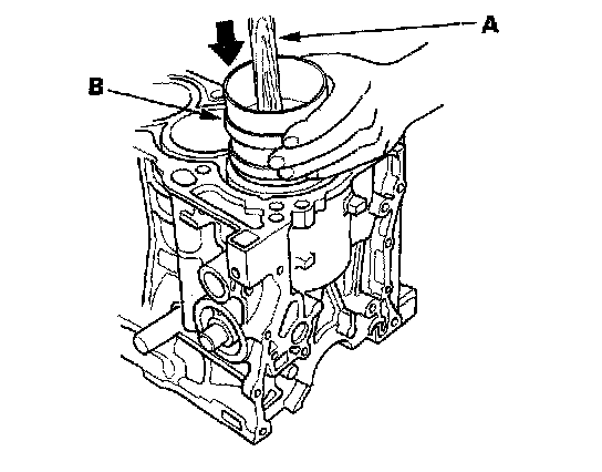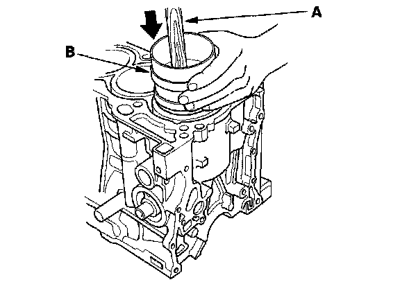 4. Position the piston in the cylinder, and tap it in using the wooden handle of a hammer (A). Maintain downward force on the ring compressor (B) to prevent the rings from expanding before entering the cylinder bore.