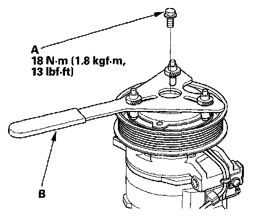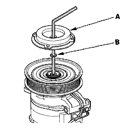 1. Remove the center bolt (A) while holding the pressure plate with a commercially available A/C clutch holder (B).