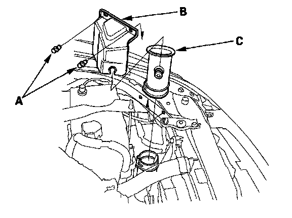 3. Remove the clips (A), then remove the air intake cover (B) and the air intake tube or duct (C).