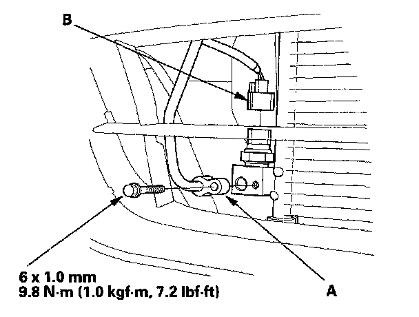 5. Remove the bolt, then disconnect the receiver line (A) from the A/C condenser. Disconnect the A/C pressure switch connector (B).