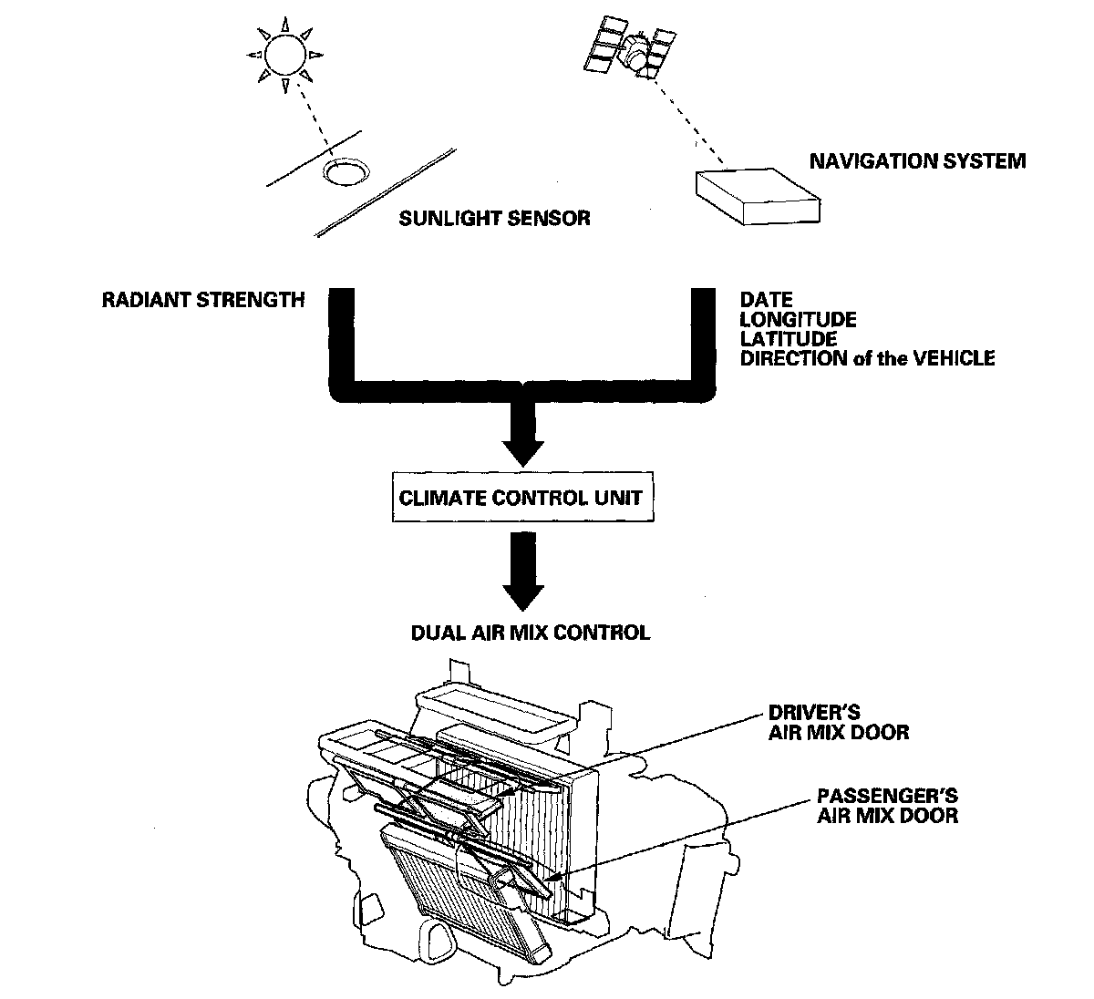 This system automatically controls the temperature and the vent mode of the air direction to the driver and passenger's side, depending on the angle of the sun, and the direction of the vehicle. It calculates information such as date, time, longitude, and latitude from the navigation system, as well as the radiant strength of the sun from the sunlight sensor, to determine the appropriate mode position and temperature to be directed to each side.
