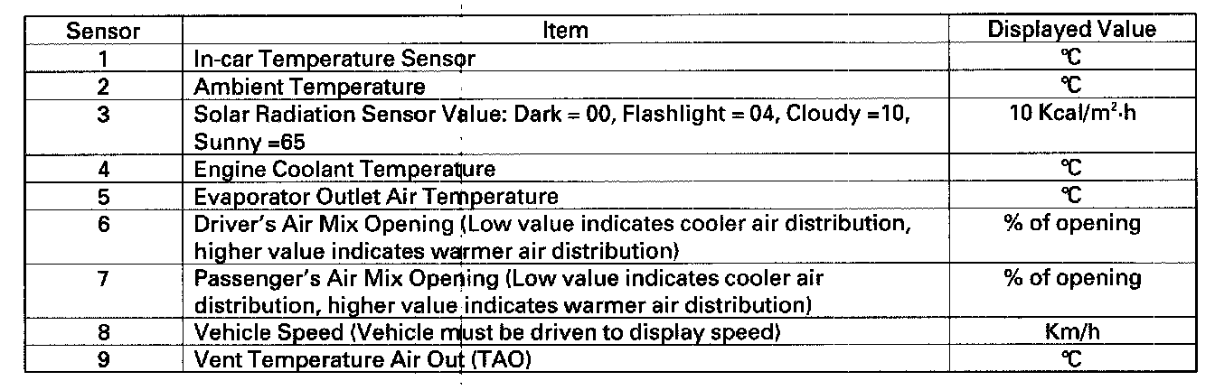 Displaying Sensor Input at the Climate Control UnitThe climate control unit has a mode that displays sensor inputs it receives. This mode shows you what the climate control unit is receiving from each of the sensors, one at a time, and it can help you determine if a sensor is faulty.