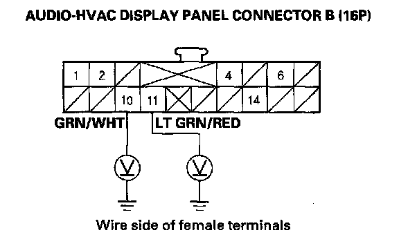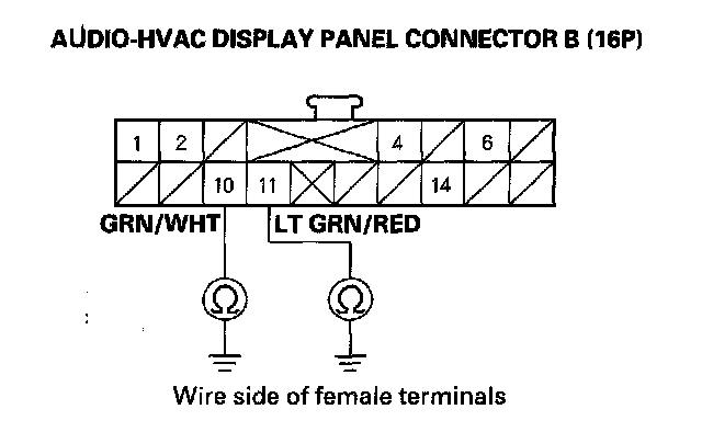 8. Check for continuity between the No. 10 and No. 11 terminals audio-HVAC display panel connector B (16P) and body ground individually.
