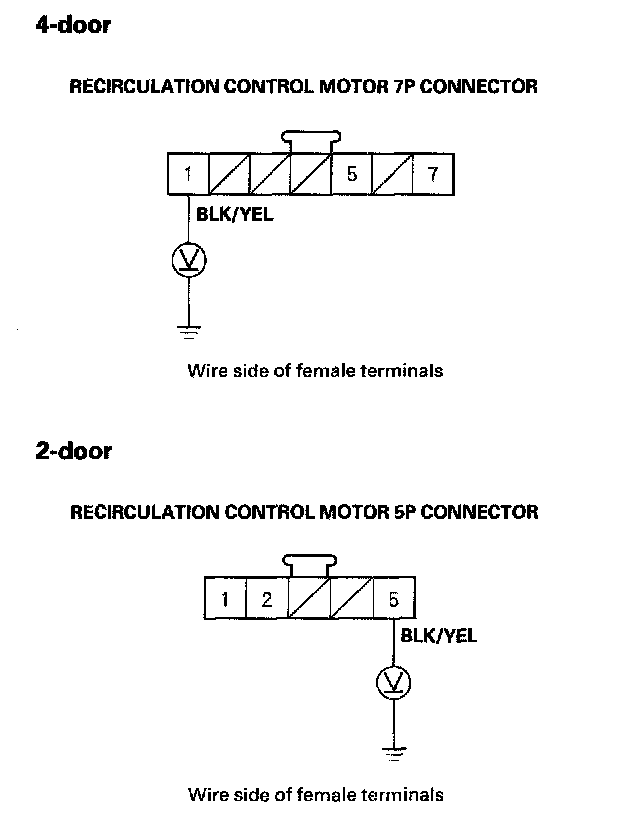 2. Disconnect the recirculation control motor 7P (4-door) or 5P (2-door) connector.