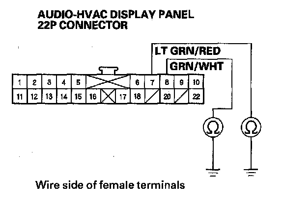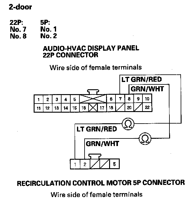 11. Check for continuity between the given terminals of audio-HVAC display panel 22P connector and the recirculation control motor 7P (4-door) or 5P (2-door) connector.
