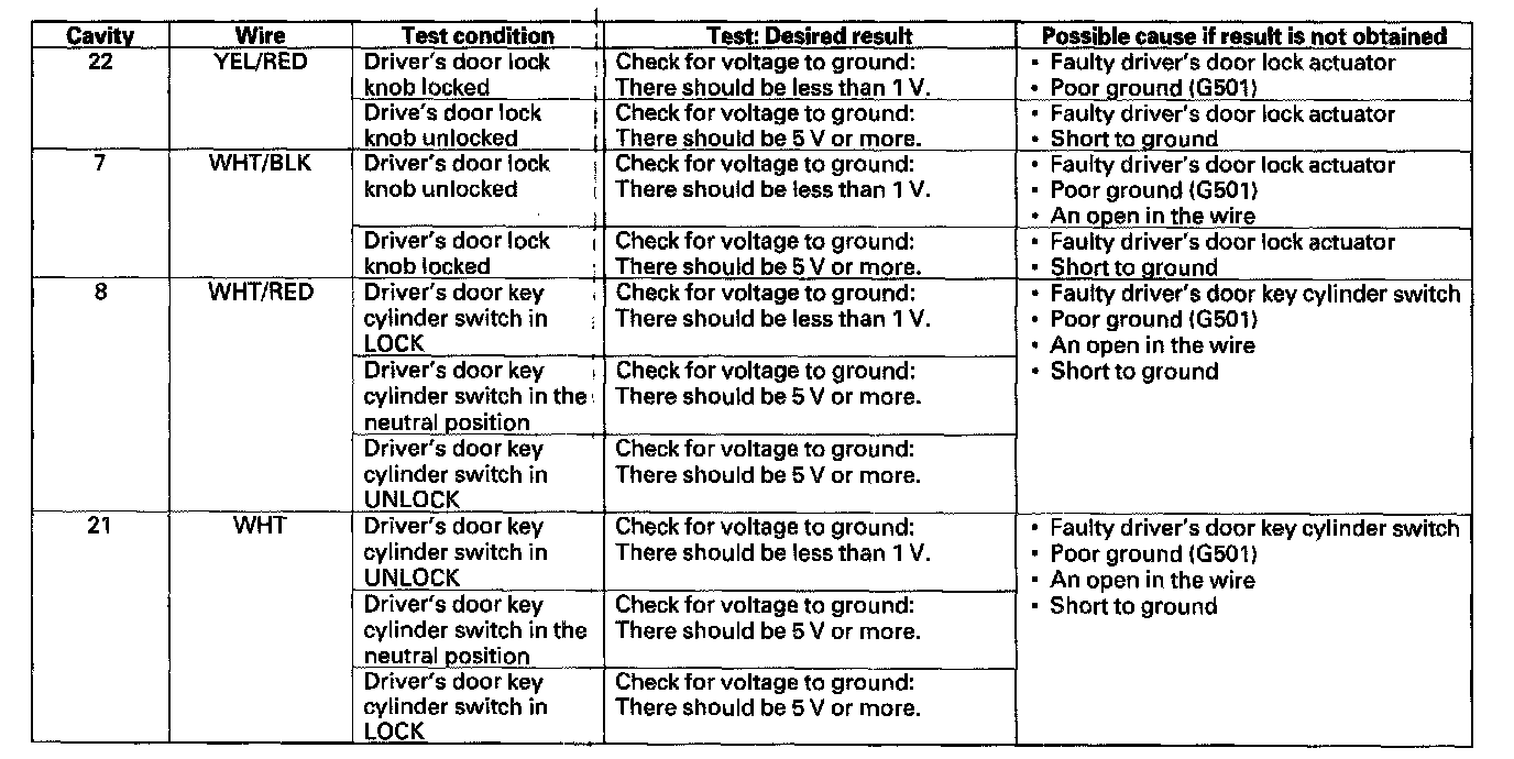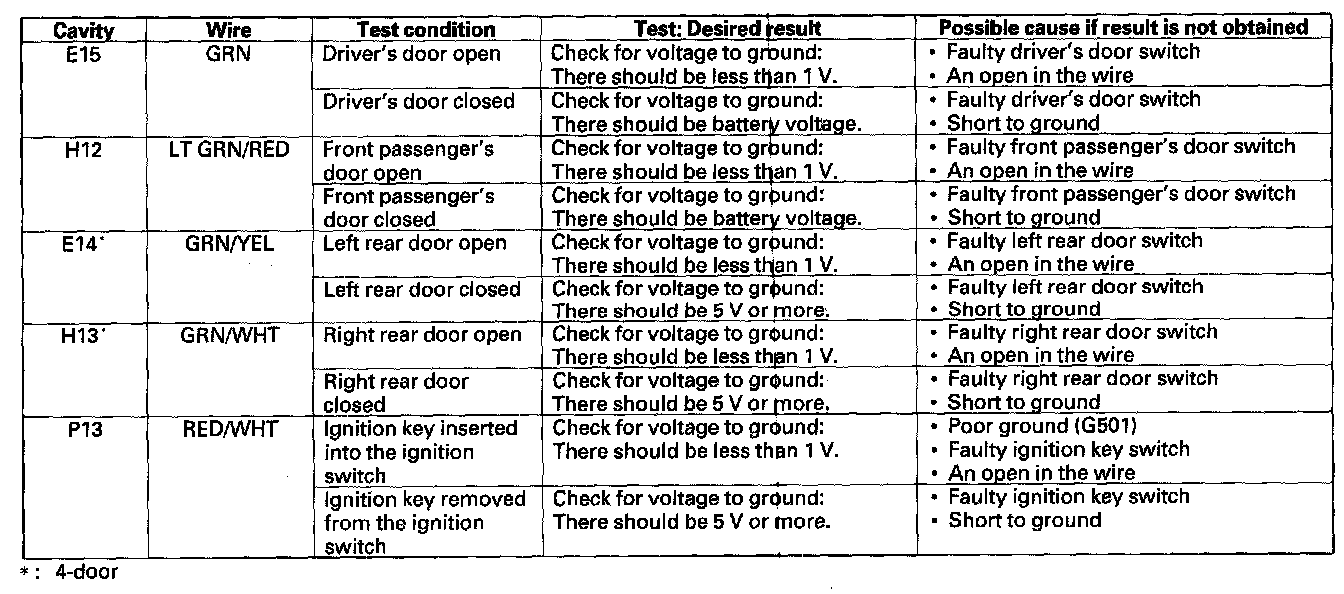 11. Reconnect the connector to the door multiplex control unit, and make these input tests at the appropriate connector.