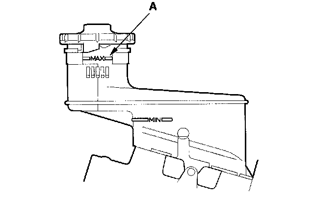 1. Make sure the brake fluid level in the reservoir is at the MAX (upper) level line (A).