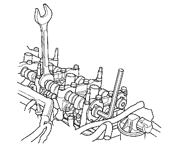 2. Hold the camshaft with an open-end wrench, then loosen the bolt.