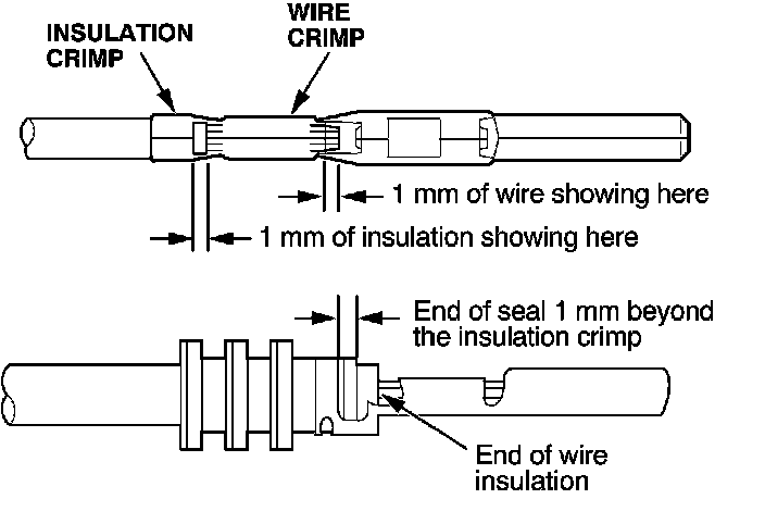 3. Strip the insulation off the end of the wire so the wire fits in the new terminal as shown. (If the wire has a wire seal, replace it with a new one from the kit.)