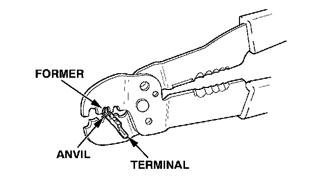 4. Position the terminal in the crimping tool slot with the solid portion of the terminal toward the anvil and the open section toward the former.