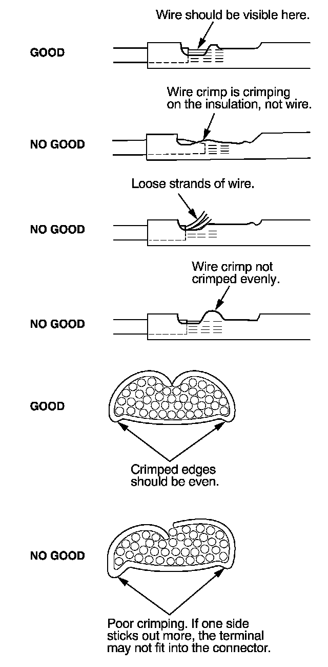 8. Inspect the quality of the wire crimp. If it has any of the following NO GOOD crimps, cut it off and start over.