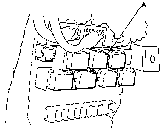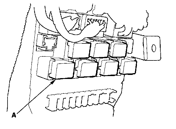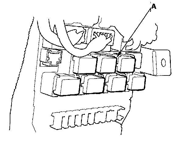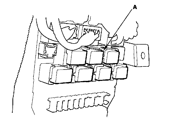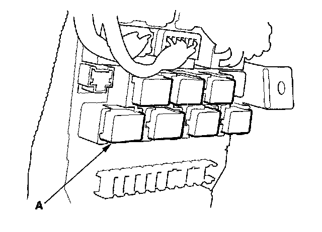 26. Remove the left kick panel; 2-door, 4-door, then remove PGM-FI main relay 1 (FI MAIN) (A) from the under-dash fuse/relay box.