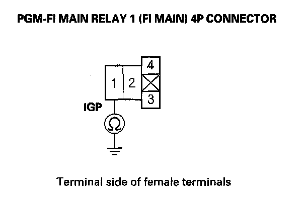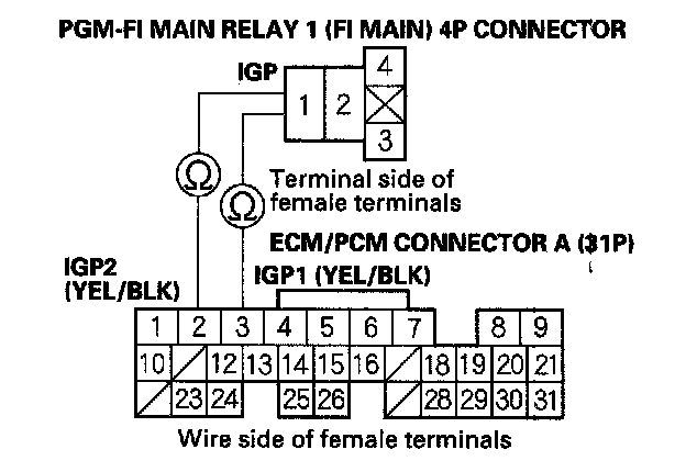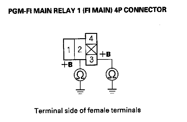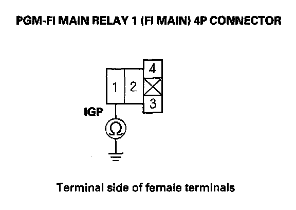 27. Check for continuity between body ground and PGM-FI main relay 1 (FI MAIN) 4P connector terminals No. 2 and No. 3 individually.