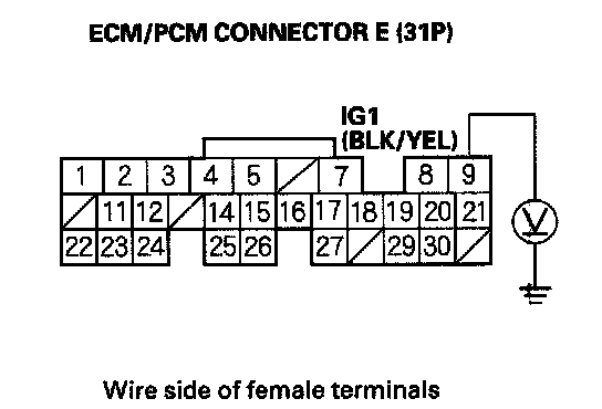 47. Measure voltage between ECM/PCM connector terminal E9 and body ground.