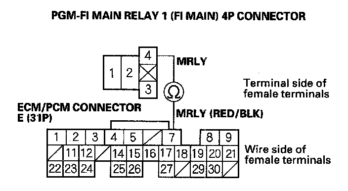30. Check for continuity between PGM-FI main relay 1 (FI MAIN) 4P connector terminal No. 1 and body ground.