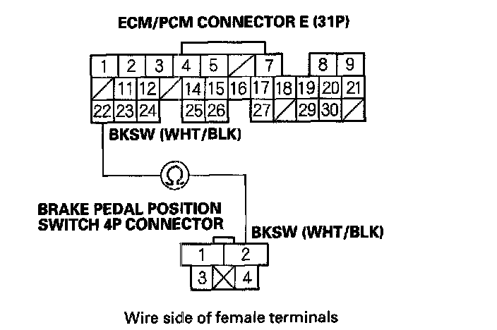 9. Check for continuity between ECM/PCM connector terminal E22 and brake pedal position switch 4P connector terminal No. 2.