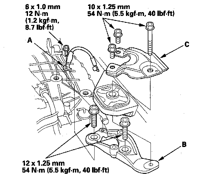 8. Remove the ground cable (A), transmission upper mount bracket (B), and bracket plate (C).