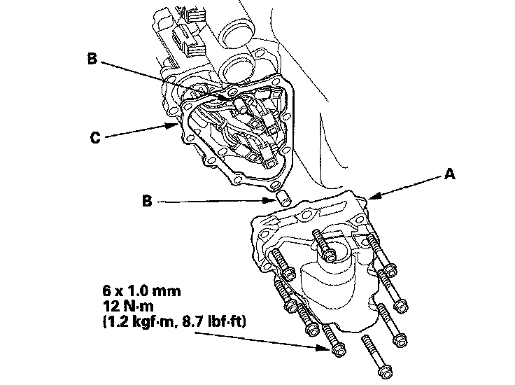 14. Remove the shift solenoid valve cover (A), dowel pins (B), and gasket (C).