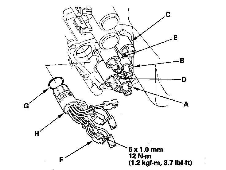 21. Install the new O-ring (G) on the shift solenoid harness connector (H), and install the connector in the transmission housing.