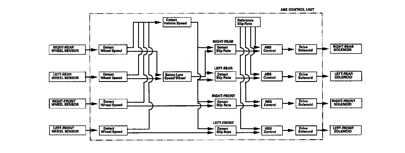 The ABS control unit detects the wheel speed based on the wheel sensor signal it received, then it calculates the vehicle speed based on the detected wheel speed. The control unit detects the vehicle speed during deceleration based on the rate of deceleration.