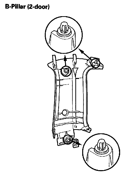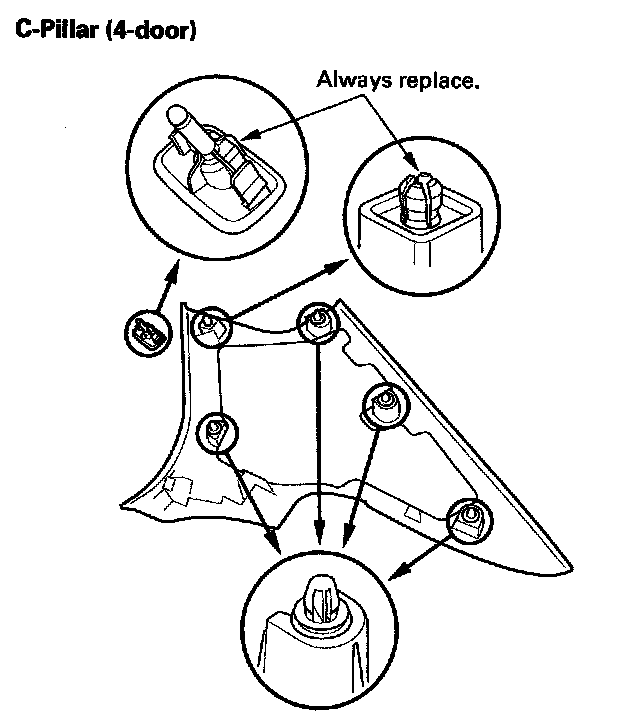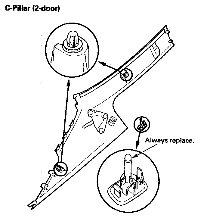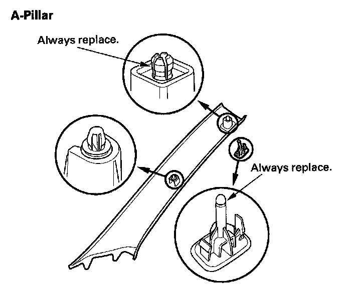 After a collision, where a side curtain airbag has deployed, replace all trim clips on that side, even if they appear to be undamaged. Replace the clips on these parts: