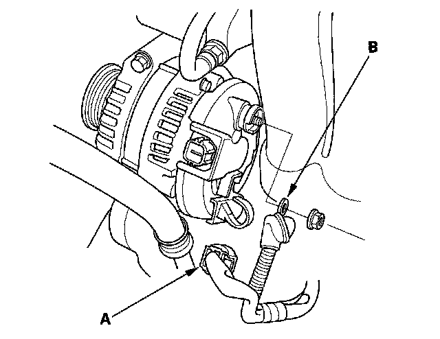 5. Disconnect the alternator connector (A), then remove the BLK wire (B) from the alternator.