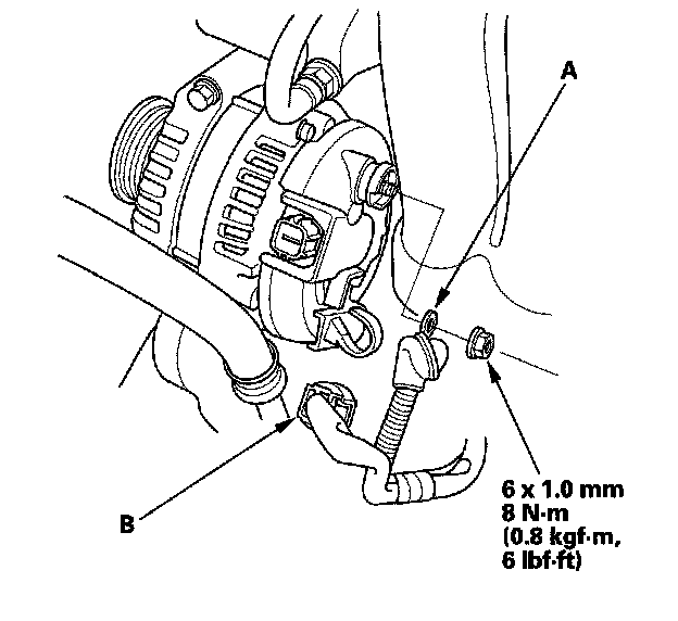 2. Install the BLK wire (A), then connect the alternator connector (B). Make sure the BLK wire crimped side of the ring terminal is facing out.