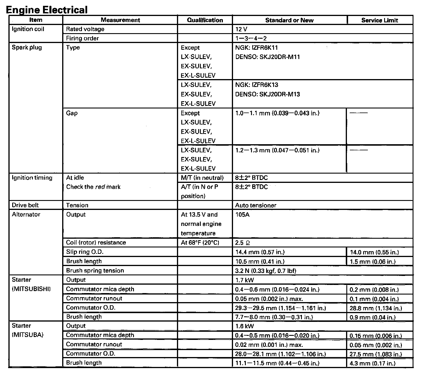 Starting and Charging: Specifications
